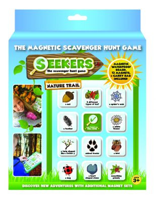 The magnetic "SEEKERS" board can be used for different scavenger hunts by purchasing additional "SEEKERS" magnet Sets.